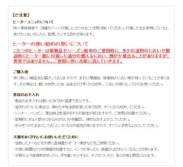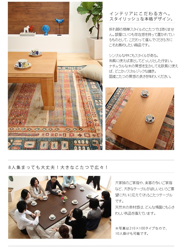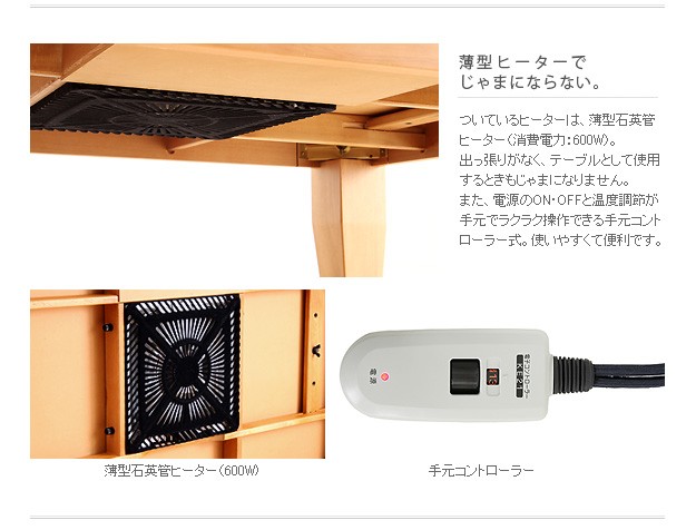 ●商品について:シンプルなデザインのこたつテーブル。どっしりとした太い脚に、厚めの天板。がっしりとした安定感のあるつくりになってます。こたつもテーブルもこれ1台でOK♪薄型石英管ヒーター(手元コントローラー式)。便利な継ぎ脚付(高さ5cm)。