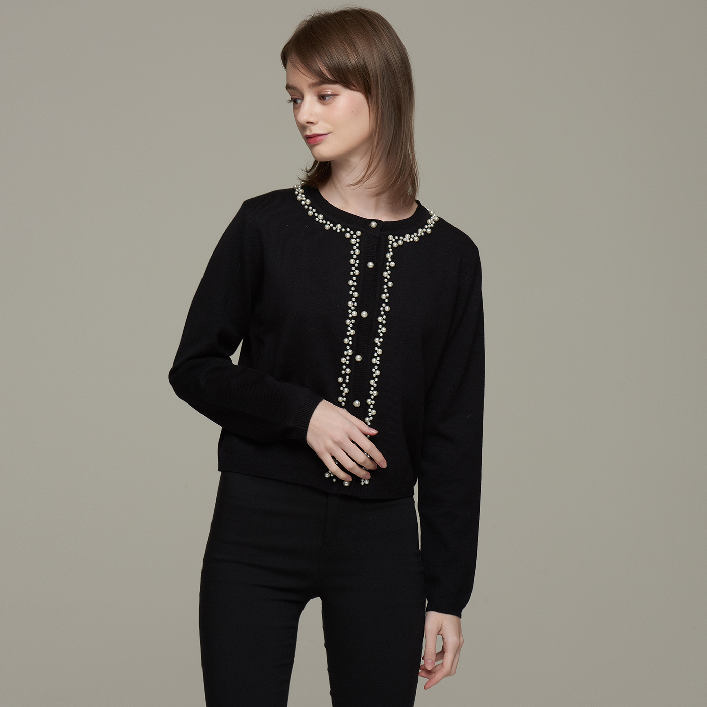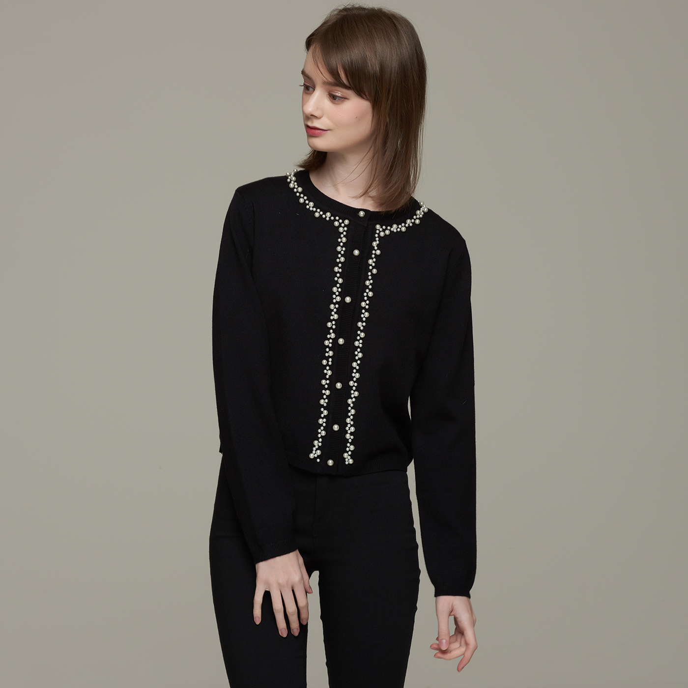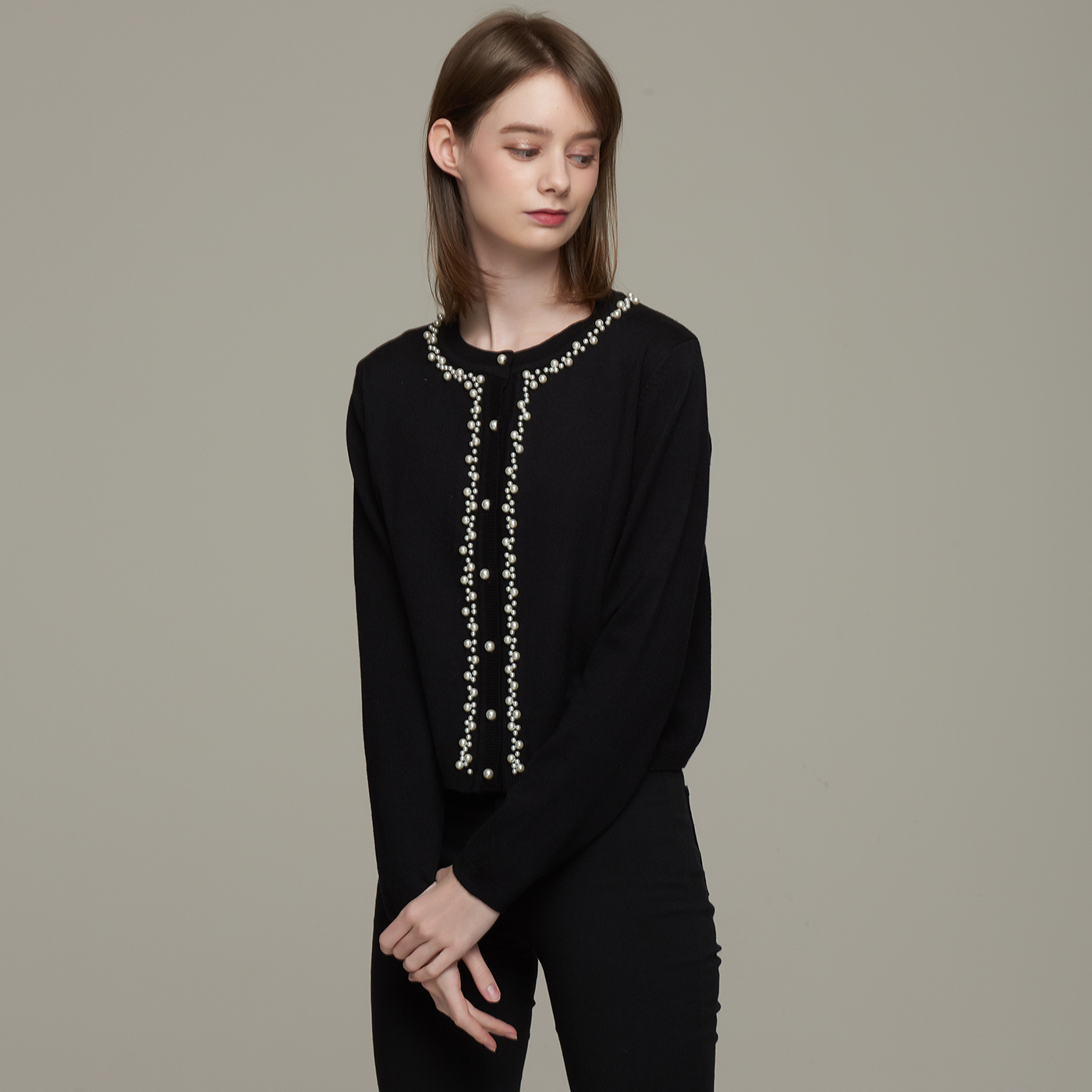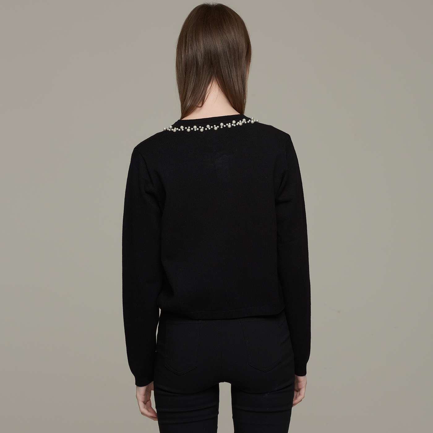 넥라인의 비딩 디테일이 고급스런 블랙 니트 가디건입니다.
