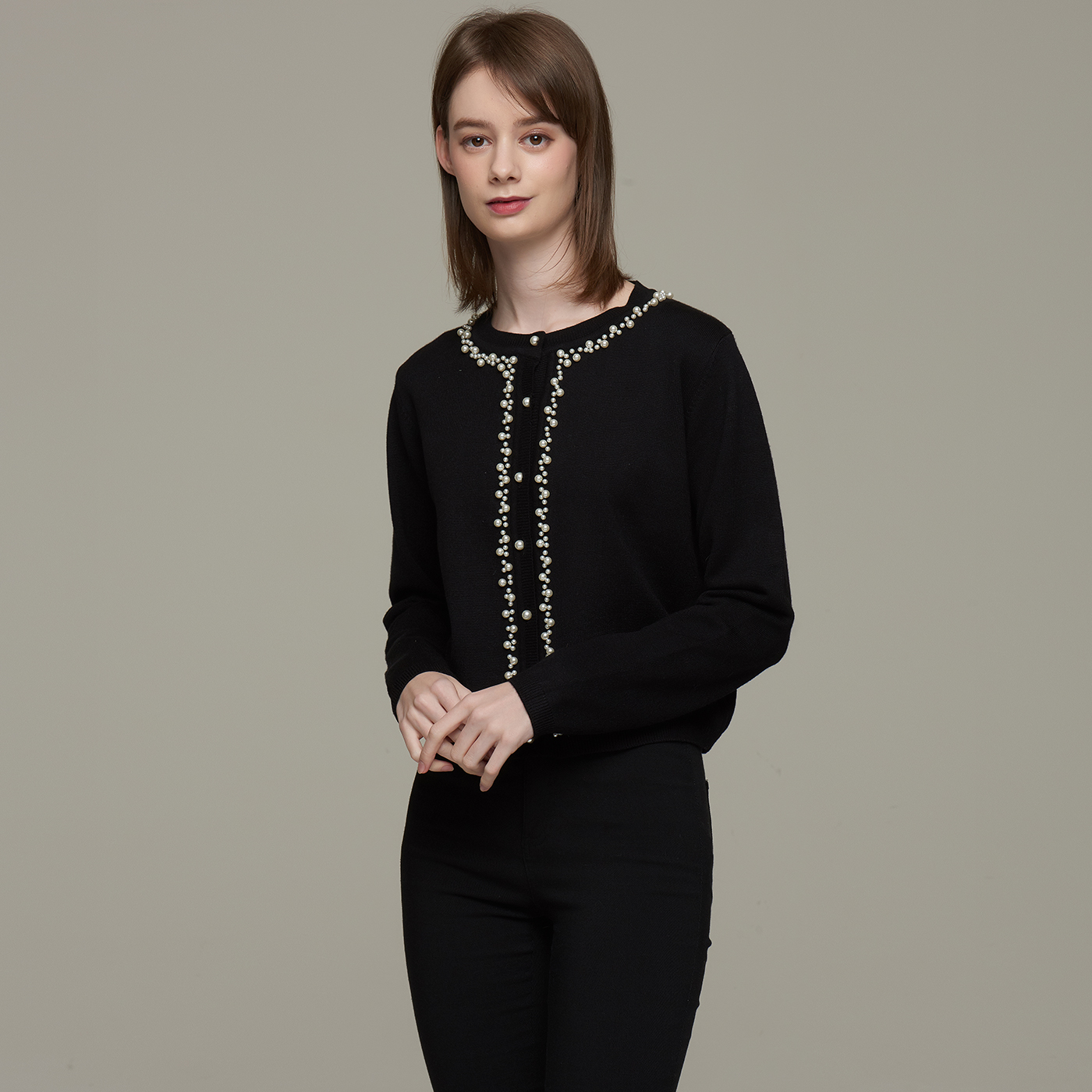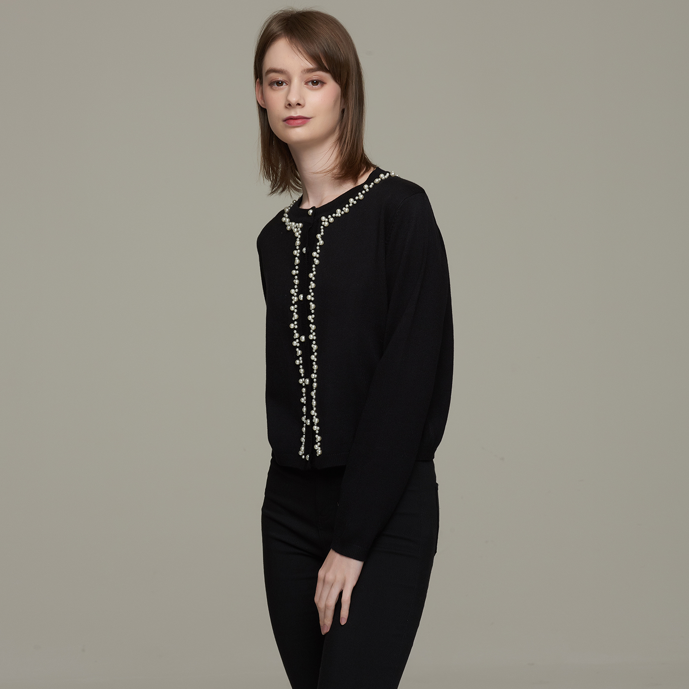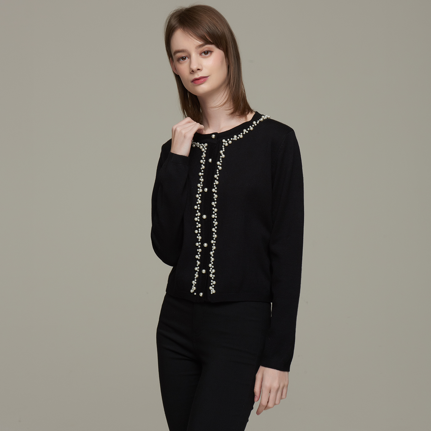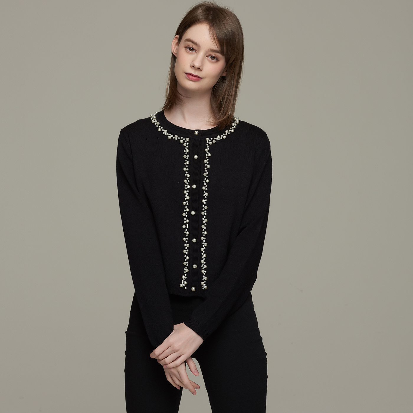 넥라인의 비딩 디테일이 고급스런 블랙 니트 가디건입니다.