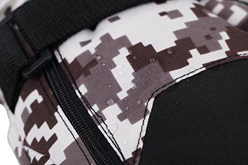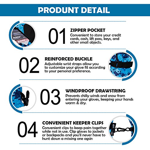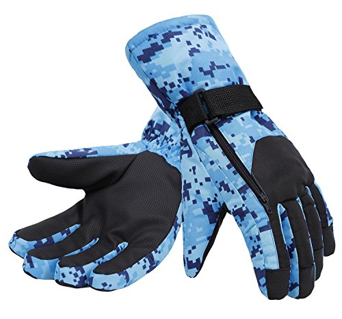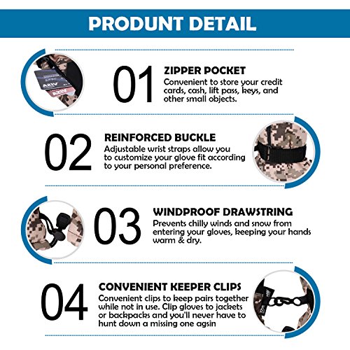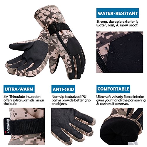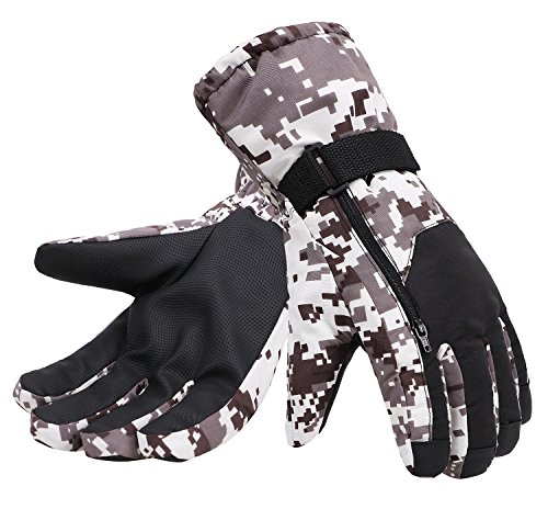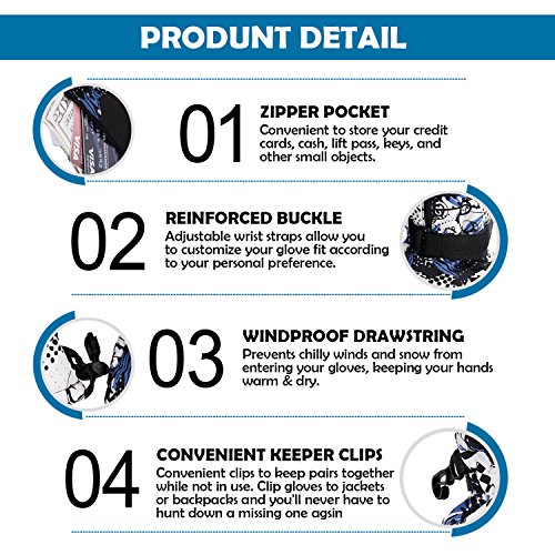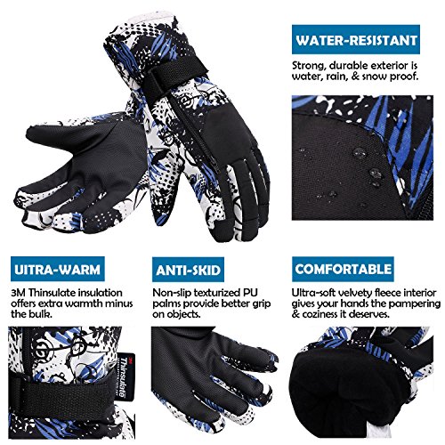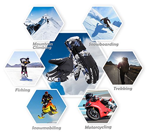 Material: Woven Polyester 3M Thinsulate Lining Waterproof fabric Size: S, M, L S: 7.7 inches from elastic to end of middle glove finger, 4.5 inches across palm of gloves, 11.6 inches total length M: 7.9 inches from elastic to end of middleglove finger, 4.7 inches across palm of gloves, 11.8inches total length L: 8.1 inches from elastic to end of middle glove finger, 4.9 inches across palm of gloves, 12.2inches total length