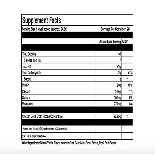 -. Feature : Contains naturally-occurring powerful amino acids, collagen type 2, Glucosamine and Chondrotin / Supports Healthy Joints, skin, muscle, inflammation and cleansing / Gut-Friendly and Paleo-Freindly protein / 20 grams of bone broth protein with zero carbs per serving / Contains Hyaluronic Acid to support digestive health