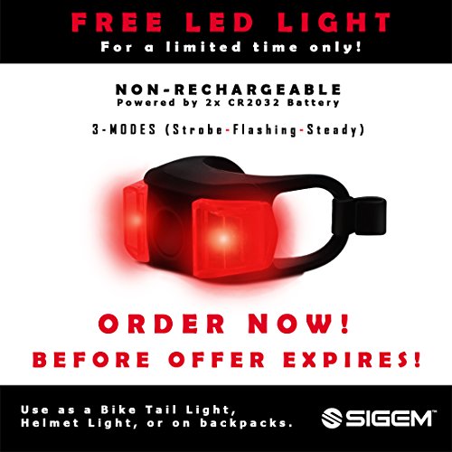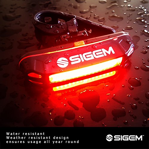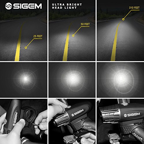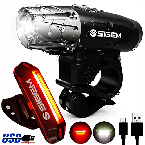 SIGEM - Premium Quality LED Bike Light Set 2 Pack? SIGEM is committed to the development of high-quality outdoor products and have developed the perfect Bike Light Set for you.? Head Light (4 Modes) USB Rechargeable High-2hr, Mid-4hr, Low-6hr, Flash-5hr Smart Charging USB Rechargeable 350-Lumens Ultra Bright Output Water Resistant IPX-5 Rating One Touch Dismount Button, Easy Installation 360° Mount Swivel Ability Rechargeable Li-lion Battery: 3.7V / 1200mAh / 4.44Wh There are two versions of Taillights, depending on Bike Light Set?chosen Set A) Silicon Tail Light (For limited time only) Non-Rechargeable Lighting Modes: Strobe, Flashing, Steady Press button in the middle to switch on and off. ? Set B) Tail Light (5 Modes) USB Rechargeable Super bright 120-lumen output 2 colors in one, 5 lighting modes Water resistant, High-capacity lithium polymer battery (3.7V 500mAh) Smart Charging: 2 hour charging time for up to 6 hours run time.?Automatic, fully charged cut-off system Lighting Modes: Red constant, White constant, Red strobe, Red slow strobe, Fast red White strobe, then off. How to use:?Press the button to select the desired mode, press again to switch off.? Mounting options: Horizontal or Vertical. Package Includes: 1 X Bike Head Light (USB Rechargeable) 1 X Swivel Headlight Mount 1 X USB Charging Cable? Set A) 1 X Silicon Taillight OR Set B) 1 X Bike Taillight Mount USB Cable (USB Rechargeable) WARNING: -- Small parts. Not suitable for children under 3 years.