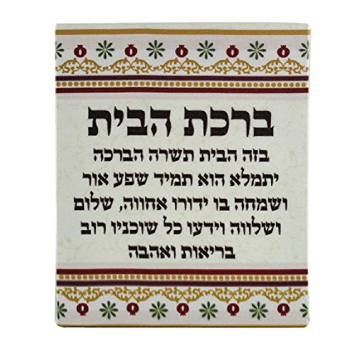 Judaica Wall Art Laser-cut Canvas on Wood Hebrew Blessing on the Home 7" x 6" (Pomegranate)