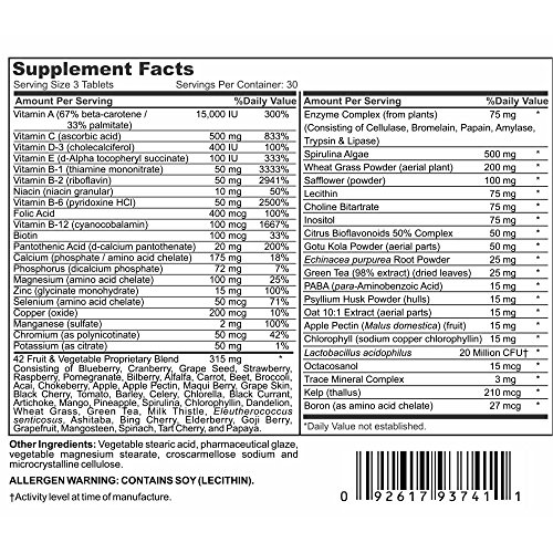 REAL FOOD DAILY MULTIVITAMIN from REAL FARMS and ORCHARDS; Our proprietary blend of whole fruits, whole vegetables, vitamins, minerals and plant enzymes provide complete daily nutrition in 3 tablets. Boost your IMMUNITY and WELLNESS to higher levels. That's why we call it Farm to Tablet. Feel better, experience natural green energy from plant power every day.