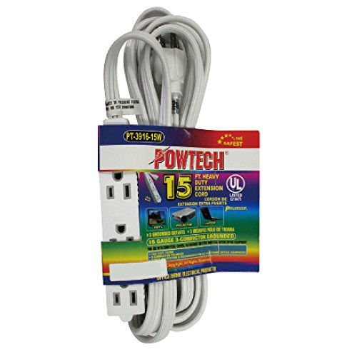 - POWTECH 15 Feet Heavy Duty 3 Outlet Grounded Indoor Extention Cord Long, 13A-125V 1625W, 3 Conducter Polarized PT-3916- 15 feet White Cord