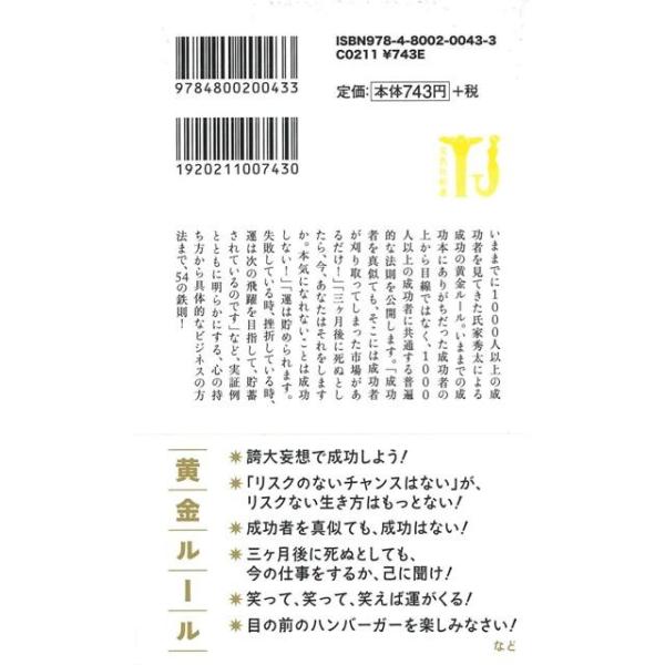 【商品説明】 定価(税込み):802円 値引き:5% OFF なぜレストランのメニューで3行目を選んでしまうのか?』の著者、氏家秀太による作品です。彼がコンサルタントとして接してきた成功者1000人の成功の法則を、ここで明らかにします。彼が実際に耳にし、そして目にし、体験した、本当に使える成功の黄金ルールを解説します。 バーゲンブック 新品 特価 格安 ビジネス 経済 経営 経営理論 法規 マネジメント 理論 | |
