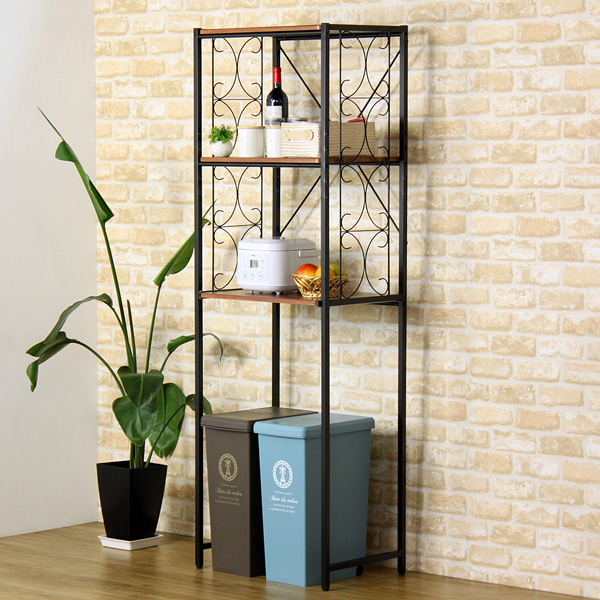 ●もっとおしゃれにキッチンを整理収納をしたいという方へおススメのキッチンラック。サイドフレームのエレガントなデザインが、収納に楽しさとおしゃれ心をプラスします。省スペースに設置できる幅60cmのスリムなサイズながら、高さを生かしてたっぷり収納。下スペースにはキッチンに欠かせないダストボックスを置けます。下棚は炊飯器など蒸気の出る家電を収納するのに便利なスライド棚。上棚にはキッチン周りの小物や雑貨を収納できます。