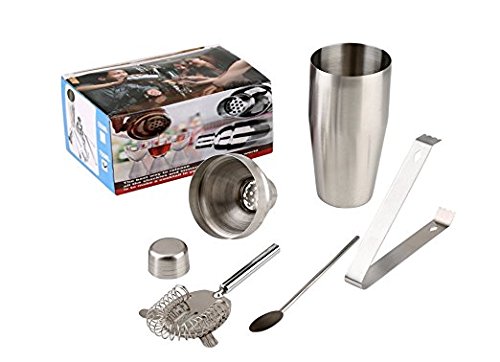 -. Feature : Simple cocktail set, very practical, in the home bar. / This five piece stainless set contains all the tools needed to mix martinis or any cocktail with ease. / It includes the following professional tools: 24 ounce cocktail shaker, stirrer, strainer, double jigger, and ice tongs. / All of them are made from stainless steel for strength, durability and easy care. / With this cocktail bar tool set you will be Impressing your friends and family by serving drinks like an experienced bartender.
