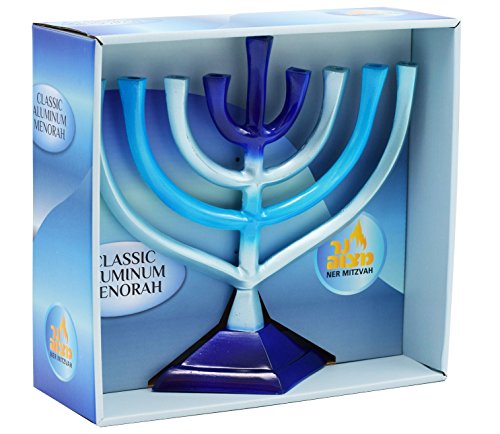 - GRADIENT BLUE ALUMINUM: A fun and artsy design brings together various shades of blue to jive seamlessly in this blue gradient menorah. Its sturdy aluminum body transitions in shade from white to light, medium & dark blue.
