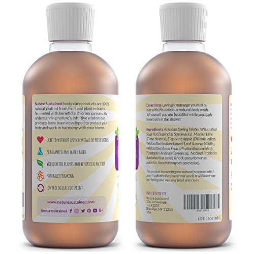 -. Feature : CHEMICAL FREE SOAP NUTS SUDS: sulfate free, silicone free, gluten free, paraben free, phthalate free, no fragrance, no harsh detergents - in fact no toxins at all, only raw and wildcrafted ingredients which clean and foam naturally while working in harmony with your body / 100% NATURAL, RAW, ORGANIC & PLANT BASED BODY CLEANSE: made exclusively from fruits and vegetables - actively feed your skin with antioxidants, phytochemicals and essential oils which remove toxins, clean and nourish / BACTERIALLY BALANCED & PROBIOTIC BODY WASH: slowly fermented and rich in plant enzymes using good bacteria - harnessing beneficial microrganisms to maximize nutrient bioavailability and nurture a healthy skin biome / NATURAL BODY WASH FOR HEALTHY SKIN: packed with absorbable nutrients and vitamins, this naturally gentle sensitive skin body wash supports your body to repair dry or damaged skin and calm skin conditions including acne, eczema, dermatitis and psoriasis / CONSCIOUS CONSUMERISM: brought to you by Nature Sustained, this biodegradable and earth friendly organic body wash is made consciously from plants grown in balance with nature, manufactured entirely with renewable energy, produced with sustainable practices and provided to you in recyclable and considerate packaging