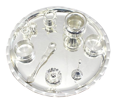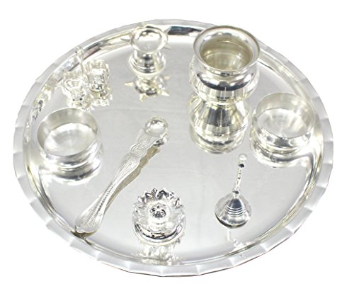 The Pooja Thali Set in German Silver consists of an intricately designed Pooja plate, as well as, an assortment of their items necessary for performing various religious rites during auspicious occasions