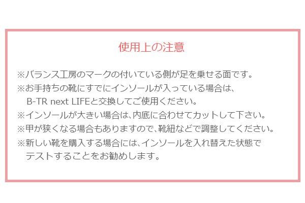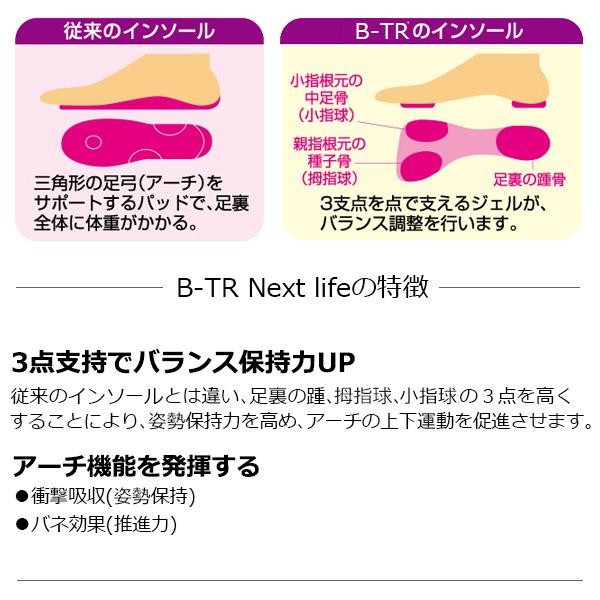 特許取得の構造で足裏の踵、拇指球、小指球の3点を高くすることにより、姿勢保持力を高め、アーチの上下運動を促進!ベージュカラーのインソール。 製造国:日本 素材・材質:合成皮革(スウェードタイプ) 仕様:特許第5227713号【商品名】BALANCEインソール B-TR next LIFE(ビートレ ネクスト ライフ) ベージュ Sサイズ(22.5~23.5cm)