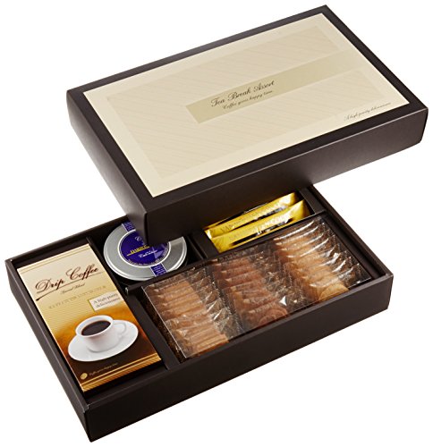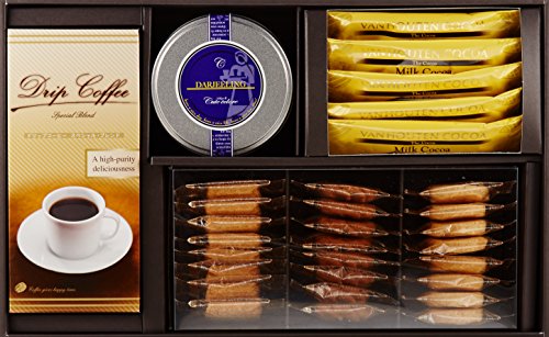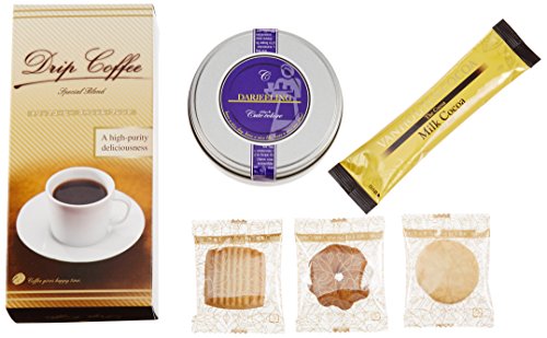 原材料:モンカフェドリップコーヒー〈スペシャルブレンド〉(7.5 g×5袋)・ティーバッグ〈ダージリン〉(2.5 g×8袋)・クッキー(24個)×各1・バンホーテンスティック〈ミルクココア〉(18 g)×10