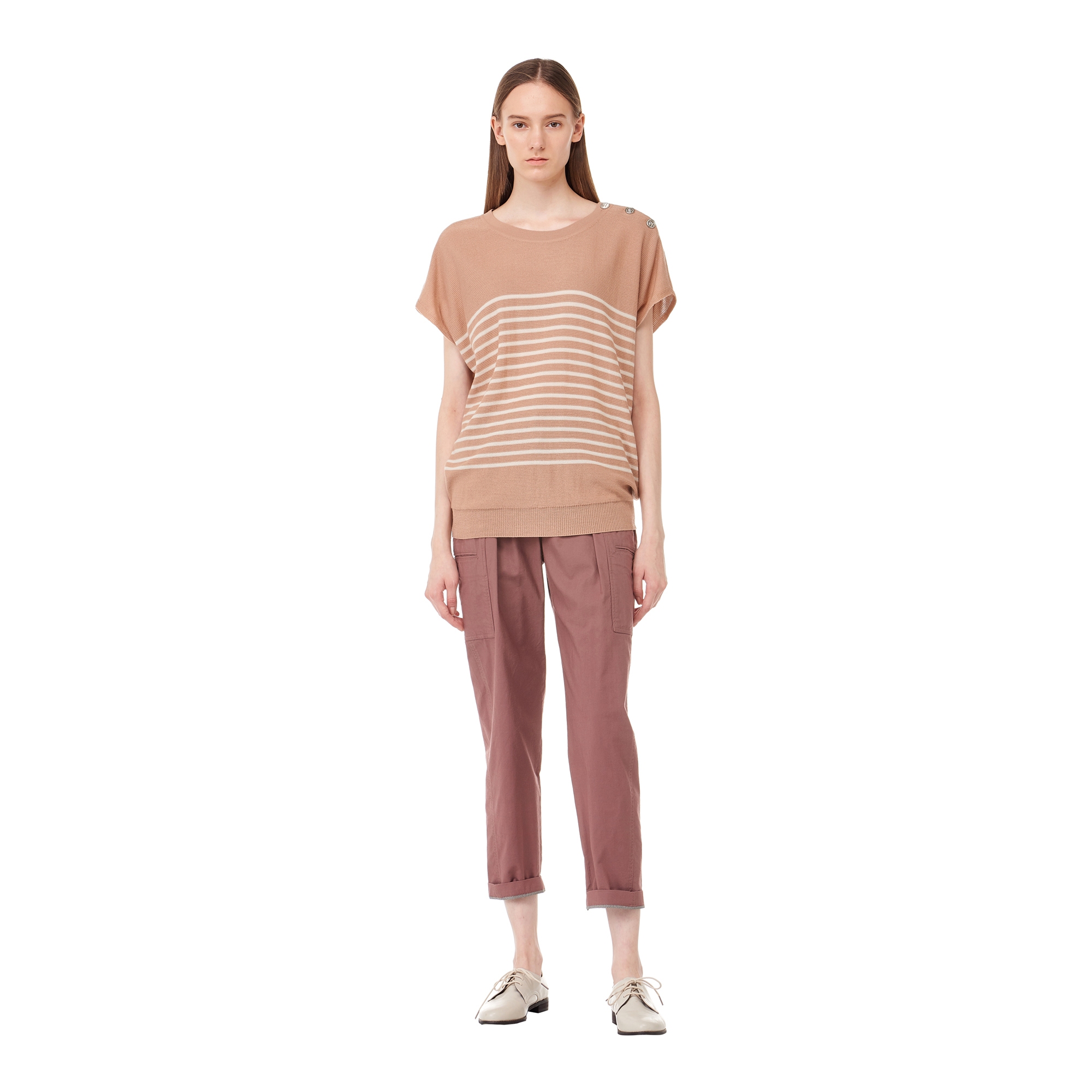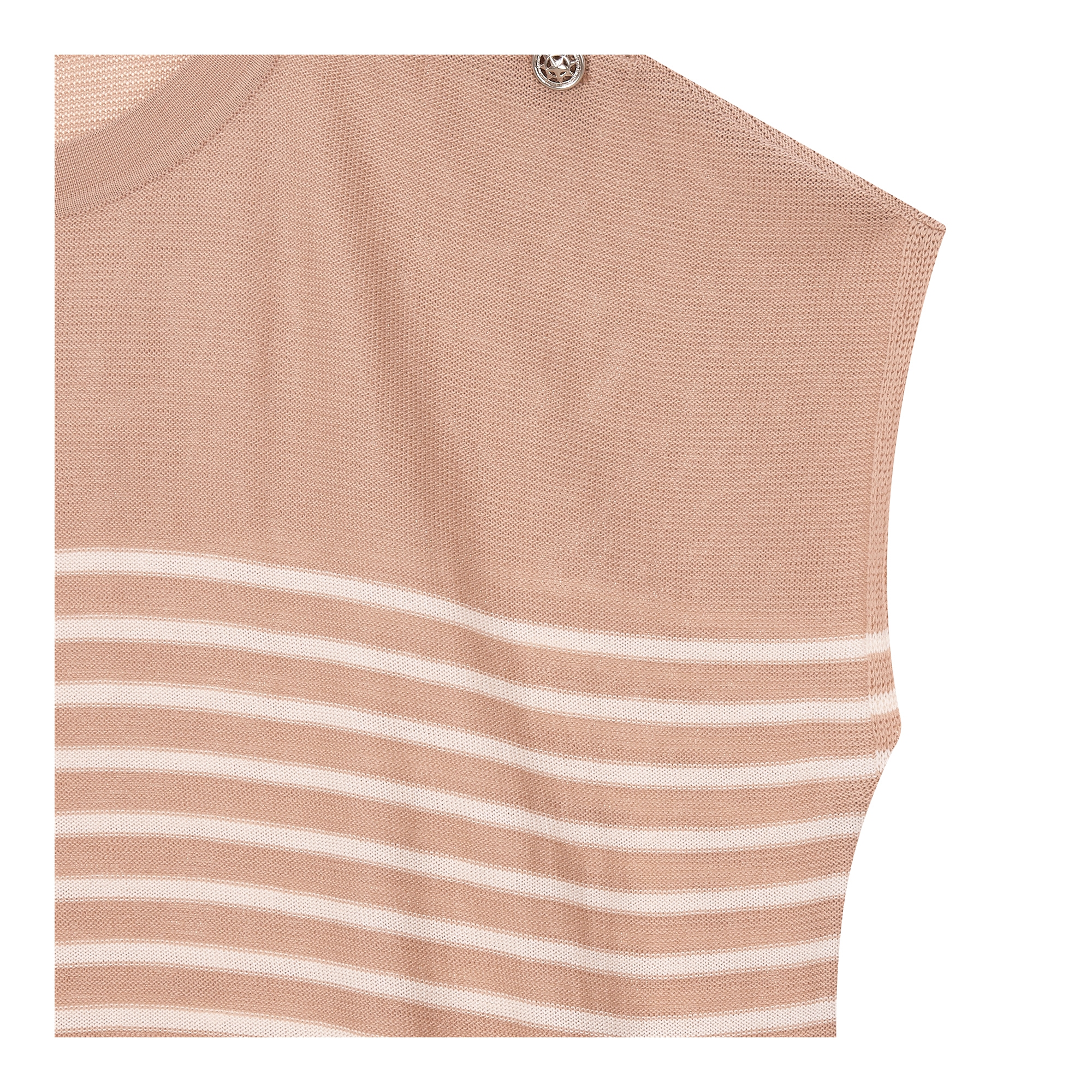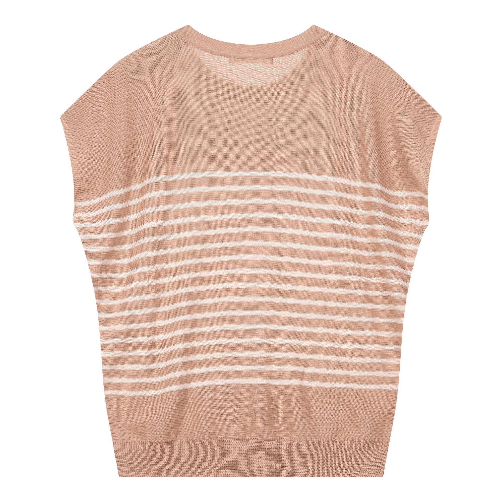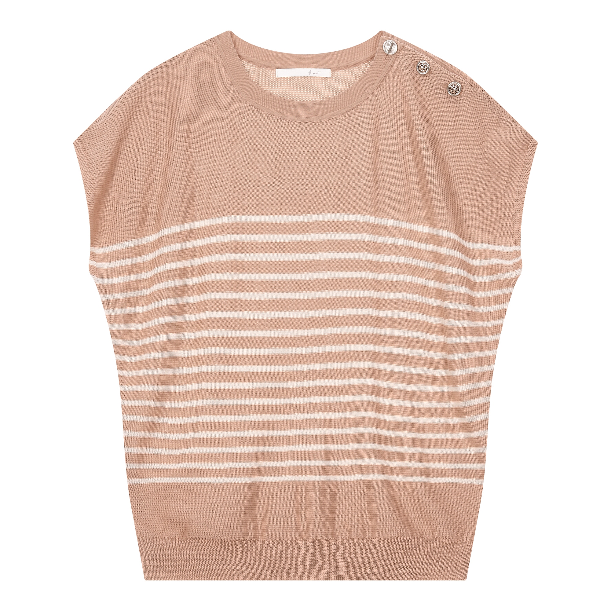 컬렉션 : 2018 Fall/Winter 디자인 포인트 : - 스트라이프 패턴 디테일이 돋보이는 캐주얼한 무드의 슬리브리스 니트 - 라운드넥과 숄더 버튼 디테일로 포인트를 더한 디자인 - 신축성이 있는 소재로 편안한 착용감을 자랑하는 아이템 스타일링 추천 : 다양한 워싱의 숏 팬츠 혹은 스키니진과 캐주얼한 스타일링을 할 수 있음