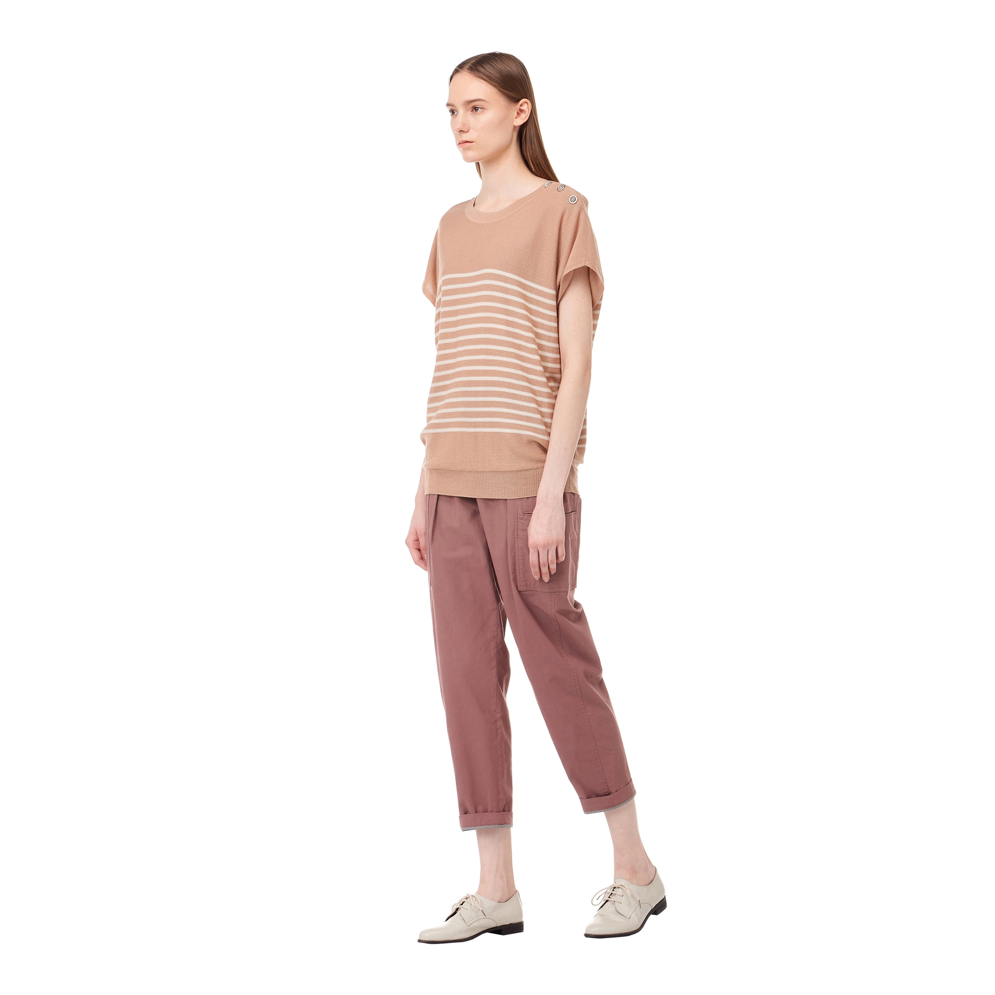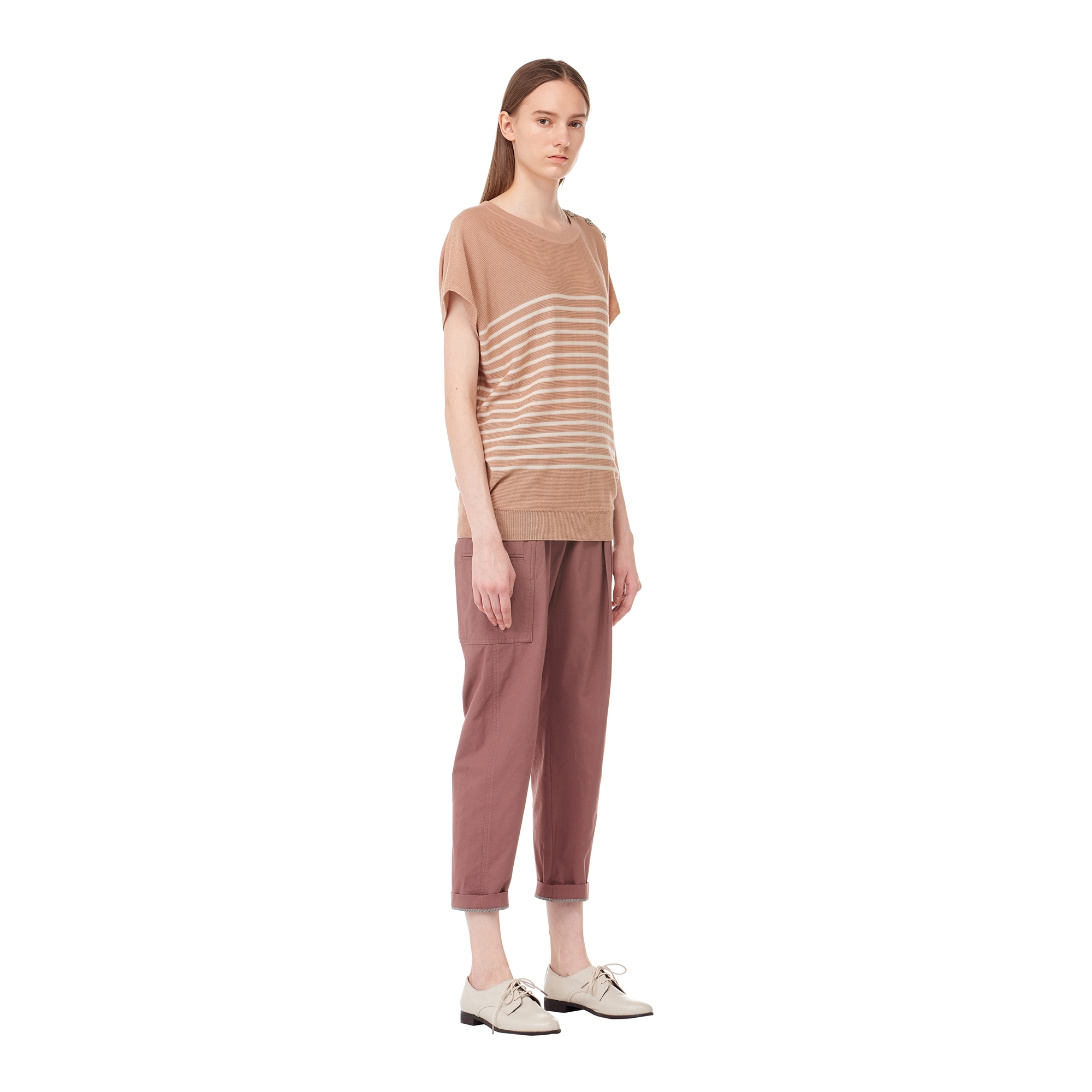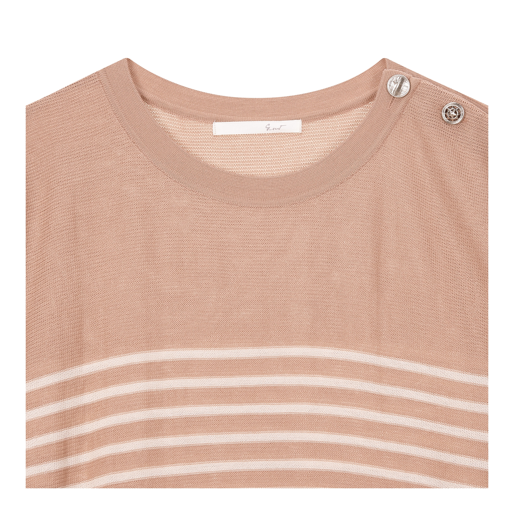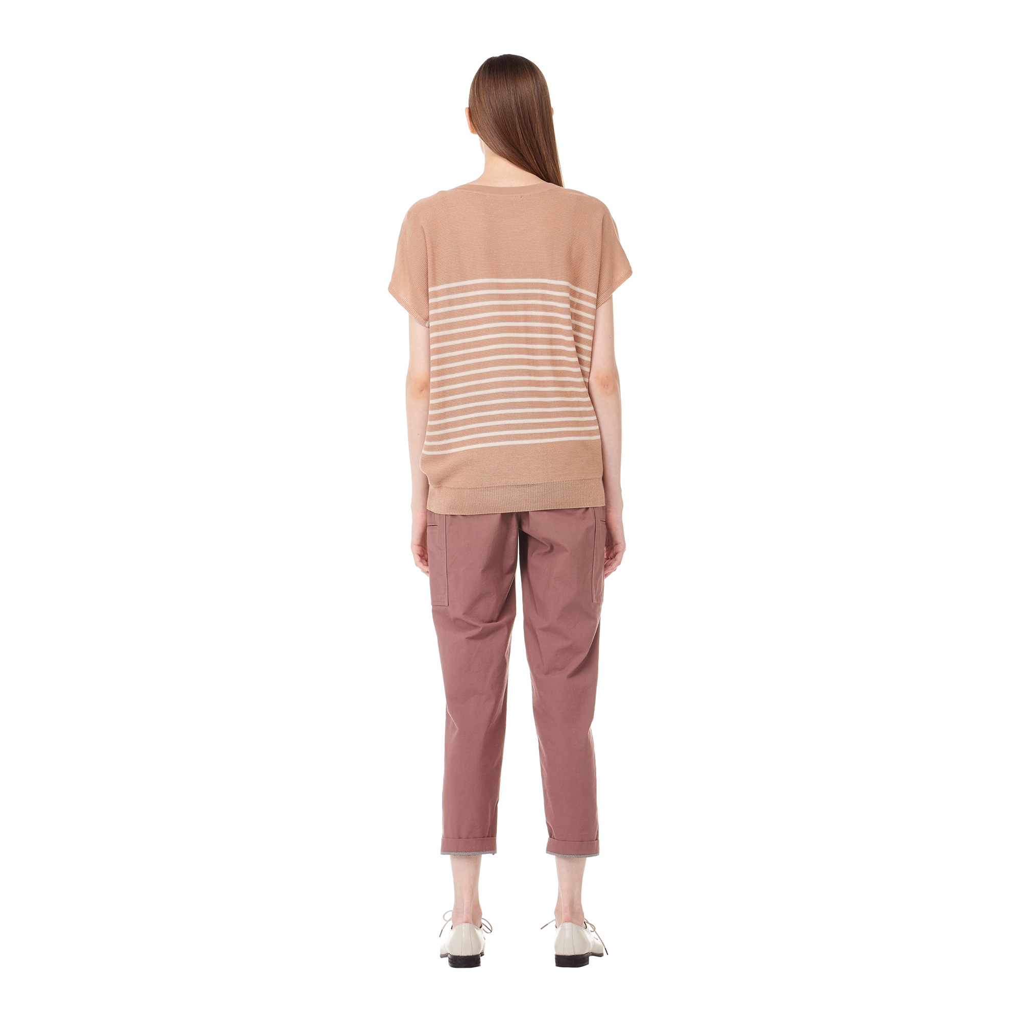 컬렉션 : 2018 Fall/Winter 디자인 포인트 : - 스트라이프 패턴 디테일이 돋보이는 캐주얼한 무드의 슬리브리스 니트 - 라운드넥과 숄더 버튼 디테일로 포인트를 더한 디자인 - 신축성이 있는 소재로 편안한 착용감을 자랑하는 아이템 스타일링 추천 : 다양한 워싱의 숏 팬츠 혹은 스키니진과 캐주얼한 스타일링을 할 수 있음