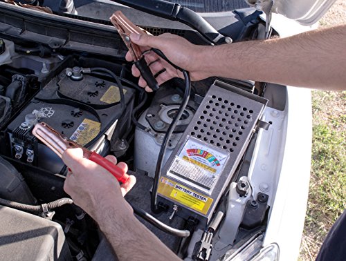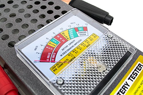 - ATTRIBUTES: This battery load tester comes with insulated super grip handles covering the copper clip connectors. Easy to read color coded analog voltage meter display with a protective clear window. Diagnostic battery analysis chart attached to the back of the tester, making it convenient for even a novice user to understand. Thin metal carrying handle placed on top provides the ability to be placed on a hook.
