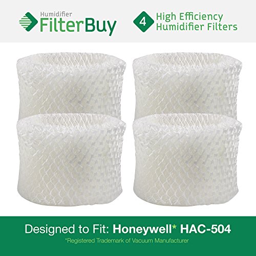 Pack of 4 FilterBuy Replacements for the Honeywell HAC-504AW humidifier filter. manufactured by FilterBuy specifically to fit Honeywell Cool Moisture Humidifier models 63-1508, ECM250i, DH835, HCM-53x, HCM-54x, HCM-300T, 310T, 315T, 330T, 350, 530, 535, 535-20, 540, 550-19, 550, 551, 560, 630, 631, 632, 632TG, 635, 640BW, 645, 646, 650, 710, HCM1000, HCM1000C, HCM1010, HCM1010C, HCM1020, HCM2000, HCM2000C, HCM2001, HCM2002, HCM2020, HCM2050, HCM2051, and HCM55019.