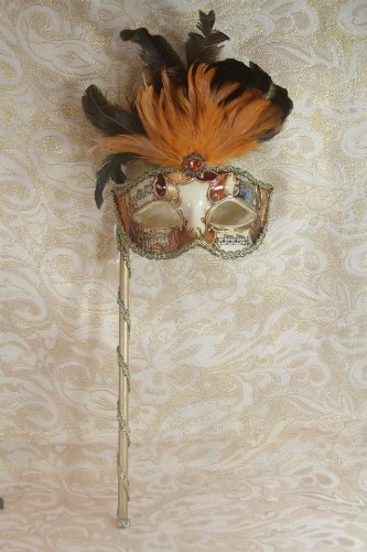 -. Title : Mysterious Musical Mardi Gras Venetian Masquerade Mask W/black Orange Feathers & Stick