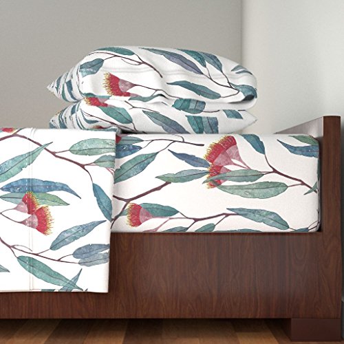 Studio : Roostery Publisher : Roostery Product Description A tropical plants, eucalyptus leaves, tropical flowers, japanese, botanical, flowers 100% natural cotton sateen sheet set. Designed by Lavish Season and made in the USA by Roostery, these Eucalyptus Leaves And Flowers sheets are a great way to introduce a completely unique pattern or a simple pop of color to your bedroom, the guest room, or the kid's rooms. Eucalyptus Leaves And Flowers Sheet Set includes a Queen size standard fitted sheet, flat sheet, and 2 pillow cases. Other sizes also available. Top hem of flat sheet and pillowcases feature a lovely folded detail with white top-stitching. Pillow cases feature selected pattern on both front and back. Fitted sheet features continuous elastic hem for a secure fit. Fitted sheets suitable for up to 14" deep mattress. The fabric for your made to order sheet set is printed on demand with eco-friendly inks in the USA on a super soft 100% cotton sateen, sourced from Italy. Each product is then custom sewn and shipped to your doorstep. Sheet Set Fabric: 100% Cotton Sateen Queen Flat sheet: 90" x 102" Queen Fitted sheet: 60" x 80" x 16" Pillowcases: 30" x 20" Recommended for mattresses up to 14" deep. Please note, while we have done our best to accurately represent the color, position, and scale of this design, the finished product may be slightly different than appears in the preview. Fabric Printed by Spoonflower Fabrics 0