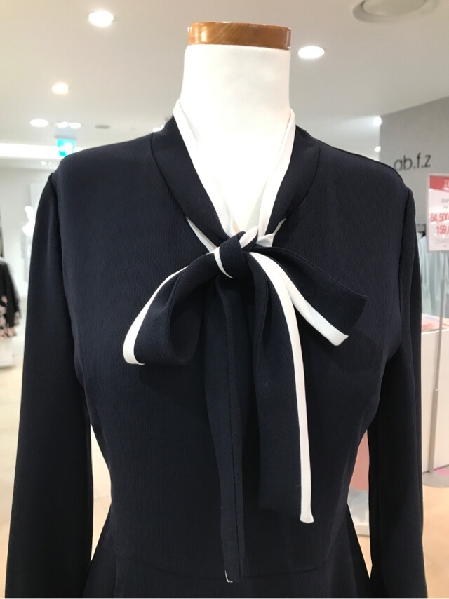넥라인리본배색 포인트를 준 여성스러운 핑샌 플레어 라인원피스입니다