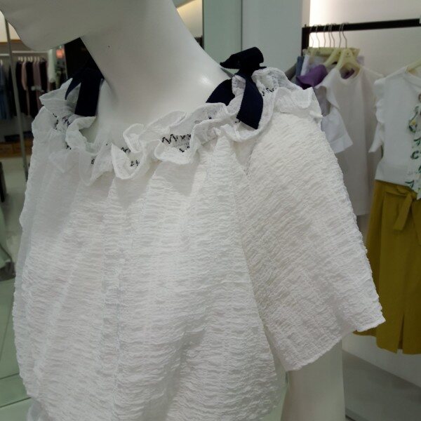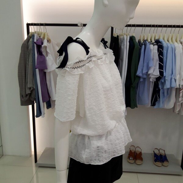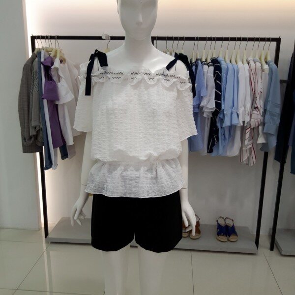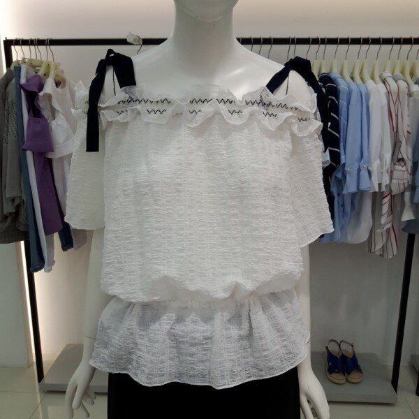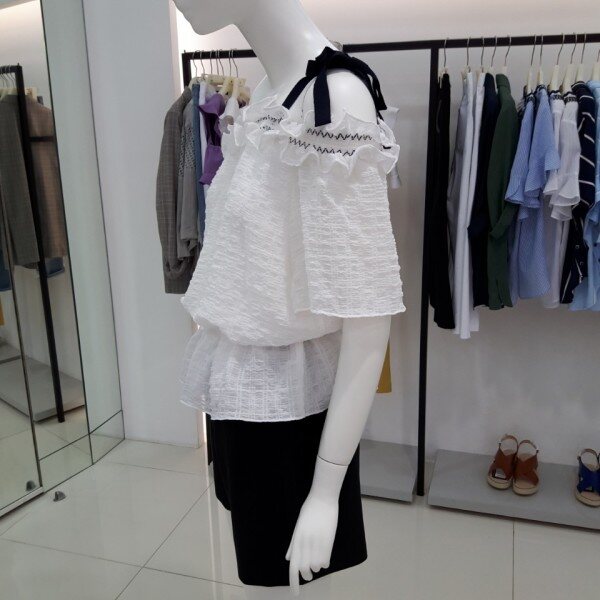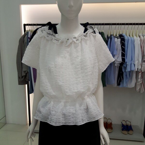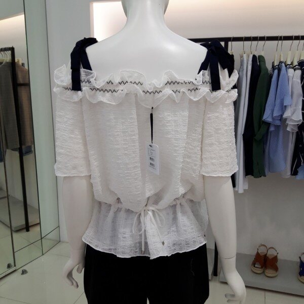 ★상품 ☆ 어깨라인 끈 으로포인트를준 허리부분 조절되는 끈으로 허리라인을잡아주는블라우스입니다