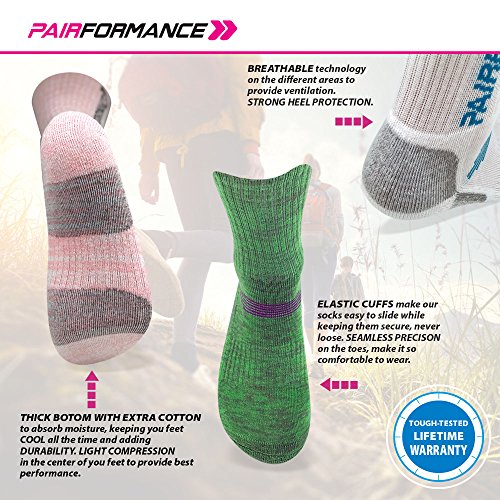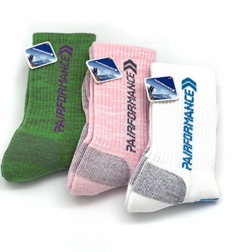-. Feature : ONE SIZE FITS ALL. 85% Cotton, 15% Spandex. STRONG and PRECISE SEWING. Pack Comes in 3 Different Colors, Green, Pink, and White, all with PAIRFORMANCE Logo in Matching Color. / MULTI PERFORMANCE SOCKS Ideal for All Year Round, HIKING, JOGGING, TREKKING, BACKPACKING, RUNNING, CYCLING or just Anything. / DURABLE COTTON SOLE to provide EXTRA CUSHION, MOISTURE ABSORPTION, LIGHT COMPRESSION and best VENTILATION. Keep your feet COOL ALL THE TIME / ANTI BACTERIAL, Avoid Blisters with HEEL PROTECTION. Keep your FEET and TOES with the right pressure protected with Exquisite FULL WRAP STITCHING. / COMFORTABLE FEELING and RIGHT SUPPORT to PERFORM AT YOUR BEST while ENJOY YOUR INDOOR or OUTDOOR ACTIVITIES.