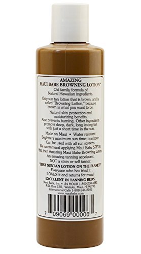 -. Feature : SIZE: Each bottle is 8 ounces (16 ounces total) / INCLUDES: Maui Babe's Browning Lotion and After Browning Lotion / BROWNING LOTION: Helps you to achieve a deep, dark, gorgeous tan in a short time in the sun / AFTER BROWNING LOTION: Seals in your tan after tanning, preventing peeling fading, and burning / DETAILS: Water-resistant; Designed for sensitive skin; Imported from Maui, Hawaii