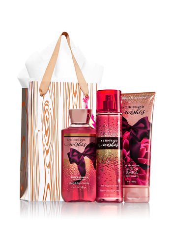 Studio : Bath and Body Works Publisher : Bath and Body Works Binding : Misc. Product Description Bath Body Works A Thousand Wishes Rose Gold Natural Gift Kit. Warm your heart a thousand times over with a festive blend of sparkling champagne, crystal peonies almond creme. Celebrate a peaceful silent night with a gift that includes an Ultra Shea Body Cream (8 oz),Shower Gel (10 fl oz) fine fragrance mist (8 fl oz). It comes in a rose gold printed gift bag with ribbon handles and includes tissue paper and a wooden tree gift tag. Measures: 5.50"W x 8.75"H x 4.50"D 0
