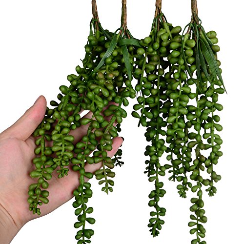 4pcs Artificial Hanging Plants Fake Succulents-GreenDec String of Pearls Fake Hanging Basketplant Lover's Tears Succulent Branch for Home Kitchen Office Garden Wedding Deco