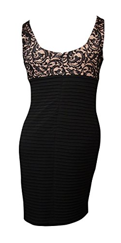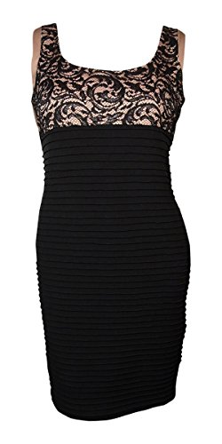 Product Description Dress features full lining, scoop neck, sleeveless, metallic lace top, pintucked jersey fabric, sheath silhouette, and concealed back zipper closure. 0