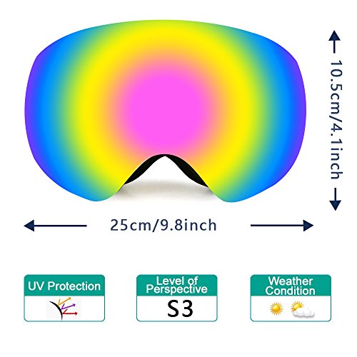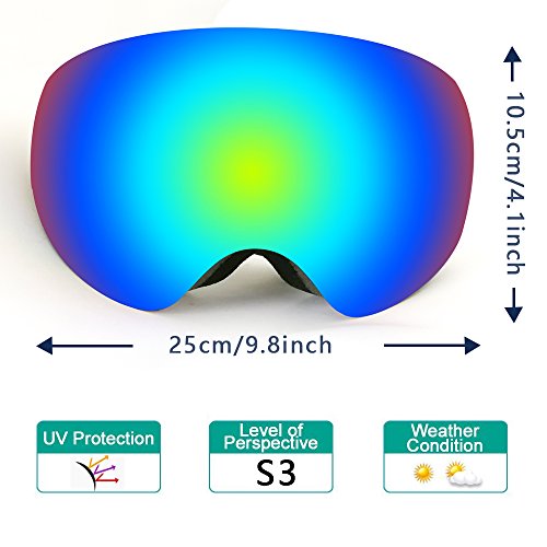 Specifications: - Lens Size: 24cm (L) x 9.8cm (W) - Band: 4cm (W) - Sponge: 1.8cm - Lens Material: PC UV - Frame Material: TPU - 100% UV protection VLT (Visible Light Transmission) Reference Scope: VLT 0-10% - For sunny days VLT 10-25% - For partially clouded to sunny days VLT 25-60% - For cloudy days and dusk VLT 60-90% - For night and heavily clouded days Notices: 1. In order not to damage the anti-fog layer when cleaning your goggles, carefully clean the lens with a soft tissue. 2. Lens replacement are sold separately. 3. Lens replacement is ONLY compatible with OutdoorMaster goggles. Not with goggles from any other manufacturer. Lens With Frame Package Includes: 1 x Kasliny Ski Goggles 1x Carrying Pouch