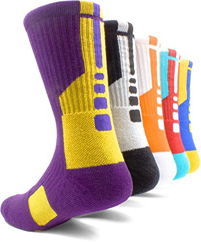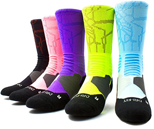 -. Binding : Apparel -. Brand : JiYe -. ClothingSize : shoe sizes 6 to 10 -. Department : mens -. Feature : ❤ GREAT GIFT IDEA:Pack of 5 vivid colorful socks.Super cool choice for you,your son,your girls.They will loves these socks.It's great for running,cycling,basketball,volleyball,football and many other sports. / ❤ PERFECT SPORT SOCKS:Needed some athtic socks for his practices?The JiYe Athtic Socks has proved to be very soft but supportive for his feet.Holds shape and doesn't sag after hard practices. / ❤ MOISTURE WICKING TECHNOLOGY:Great for walker's and runners' who feet sweat,Dri-Fit fabric moves sweat away from your skin,keep your feet dry and comfortable. / ❤ UNRIVALED SUPPORT FOR YOU:With extra cushioning in areas of the foot more susceptible to impact and injury,the Nanooer Dri-FIT Crew Basketball Socks deliver and sweat-wicking power for superb comfort on the court. / ❤ SIZING GUIDE:Large = US Shoes Size,Men's 6.5-10 and Women's 8-12 As these sport compression socks are dri fit socks,so the size is a little tight,it is normal. -. IsAdultProduct : 0 -. ProductGroup : Apparel -. ProductTypeName : SOCKSHOSIERY -. Size : Men's 6.5-10 and Women's 8-12 -. Title : Elite Basketball Socks 5 Pack|Dri-Fit Athletic Crew Sport for Boy Girl Men Women