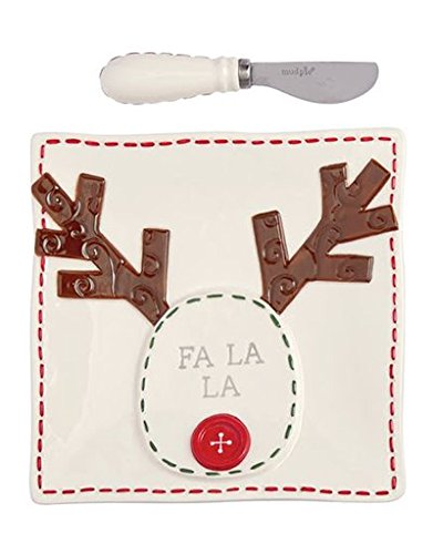 - Ceramic cheese plates with stitching detail feature layered ceramic reindeer icon with ceramic button nose and debossed "FA LA LA" sentiment. Comes with silver plate spreader with ceramic handle. Arrives gift boxed with French ticking ribbon and gift tag.
