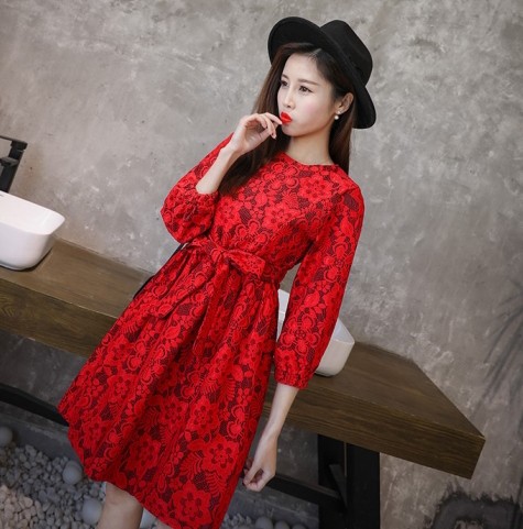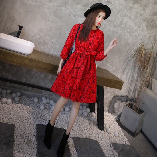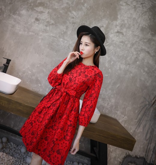 ドレス ワンピース 膝上丈 長袖 リボン 花柄 華やか パーティー 二次会 drgz1557