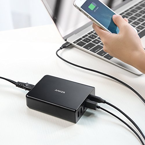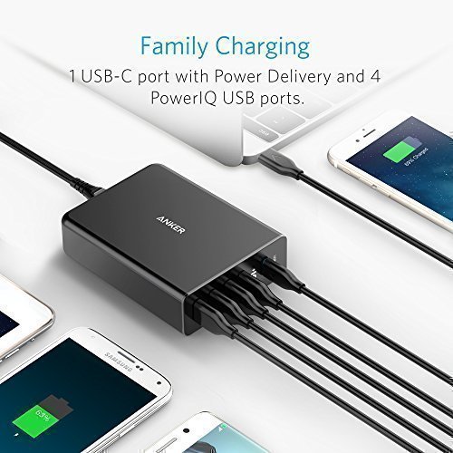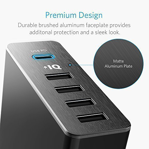 Five Ports: 1 USB-C port with Power Delivery and 4 standard USB ports with PowerIQ allow simultaneous multi-device charging at high speed.