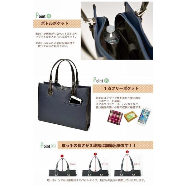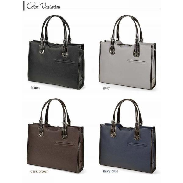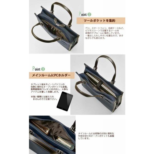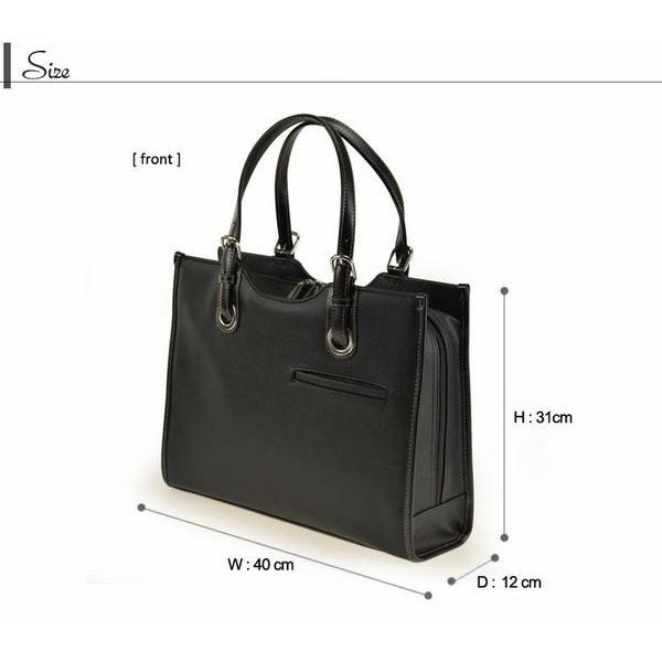 メンズビジネスの機能性を女性目線の使いやすさに応用したお仕事用トートバッグ。 ●本体サイズ:幅40x高31x行12(cm) ●本体重量 :約 980g(ショルダーベルト含まず) ●仕様 :【サブルーム 前後 各1】【サブルーム 前側】・スマホサイズオープンポケット×1・オープンポケット×1・ ペン差し×2 【メインルーム内装】・パソコンホルダー(マジックテープ留め)×1・オープンポケット×2 【後面】・ファスナーポケット×1 |