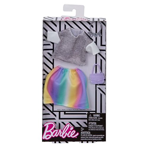 -. Binding : Toy -. Brand : Barbie -. EAN : 0887961551594 -. Feature : Dress Barbie doll (sold separately) in these trendy looks designed to express personal style / Each fabulous outfit comes with two accessories to mix and match / With modern silhouettes, pretty colors and stylish accents, the clothing is designed for storytelling fun / Options range from cool pants, skirts and tops to pretty party dresses -- and everything in between / Accessories may include fashion items like purses, jewelry or sunglasses -. IsAdultProduct : 0 -. Label : Mattel -. Manufacturer : Mattel -. Model : FKT03 -. MPN : FKT03 -. NumberOfItems : 1 -. PackageQuantity : 1 -. PartNumber : FKT03 -. ProductGroup : Toy -. ProductTypeName : TOYS_AND_GAMES -. Publisher : Mattel -. ReleaseDate : 2017-08-22 -. Studio : Mattel -. Title : Barbie Fashions Complete Look Gray Top & Rainbow Skirt Set -. UPC : 887961551594 -. Warranty : No Warranty