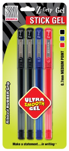 Zebra Z-Grip Stick Gel 0.7mm, 4 Pack, Assorted (42504)