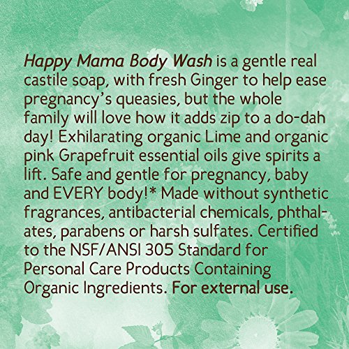 Happy Mama Body Wash is safe, natural ginger citrus castile-based liquid soap formulated especially for pregnancy and ideal for noses that are sensitive from morning sickness. Certified contains organic calendula. Detergent free, non-toxic and made without fragrance chemicals, Triclosan, parabens or harsh sulfates.
