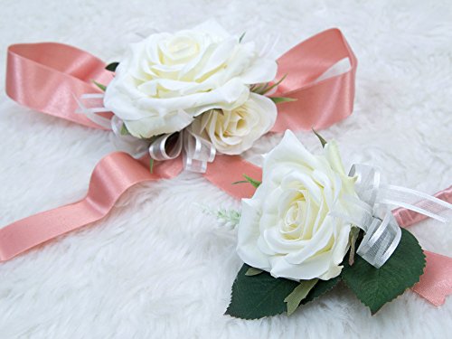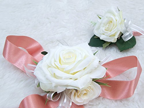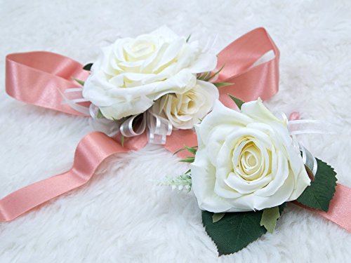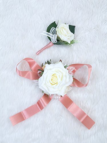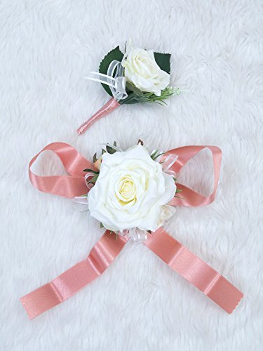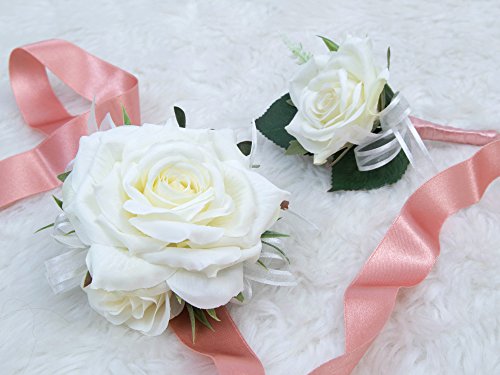 Wedding Prom Wrist Corsage Single Silk rose and Boutonniere Set Pin Ribbon Included (Classic Ivory theme)