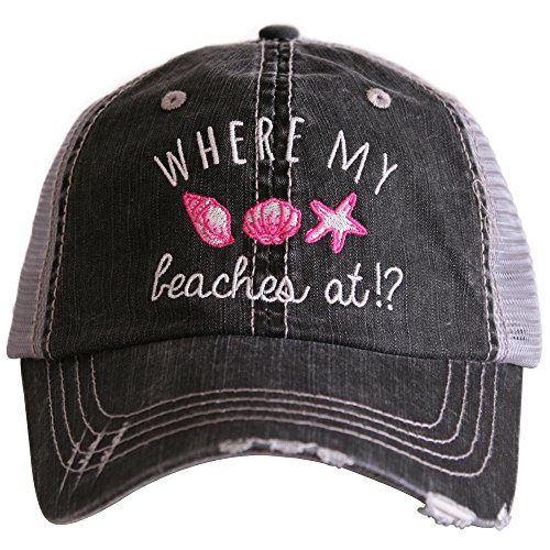 -. Brand : Katydid -. Department : womens -. Feature : One size fits most, with an adjustable Velcro tab / Curved bill for a comfortable fit and great sun protection / Mesh back for comfort and breathability / Authentic distressed detailing; 80% Cotton, 20% Poly / Designed and embroidered in the USA by Katydid -. Model : KDC-TC-367 -. ProductGroup : Apparel -. ProductTypeName : APPAREL -. Title : Where My Beaches At Women's Trucker Hats Caps