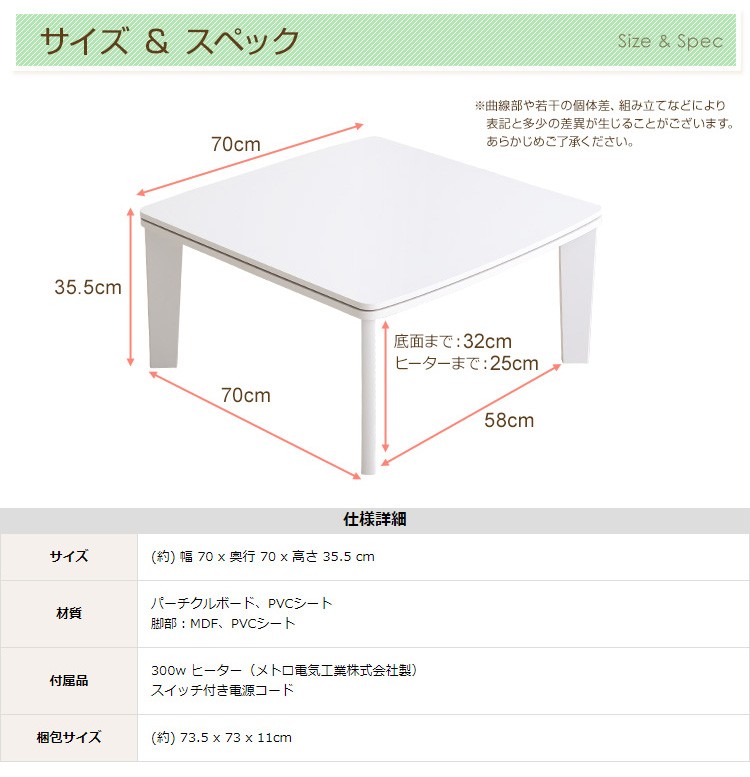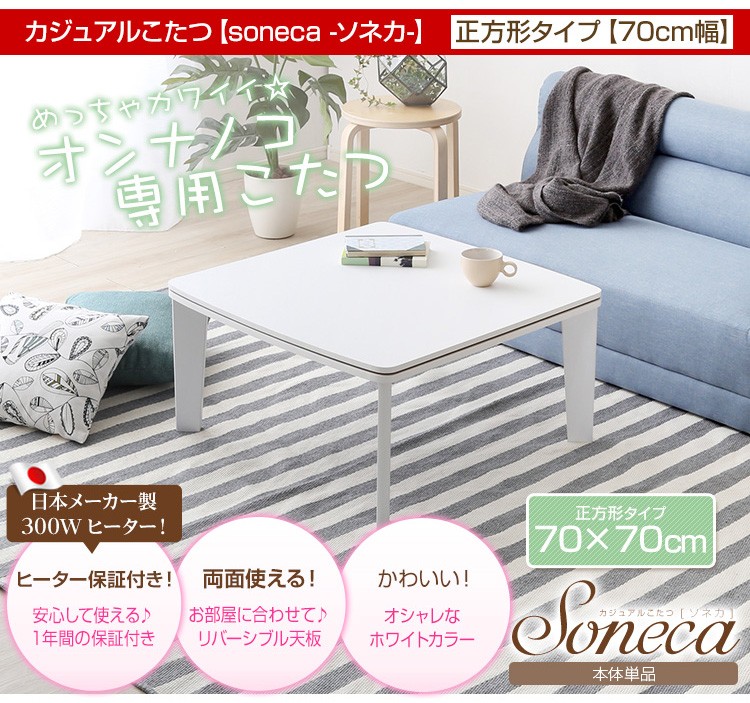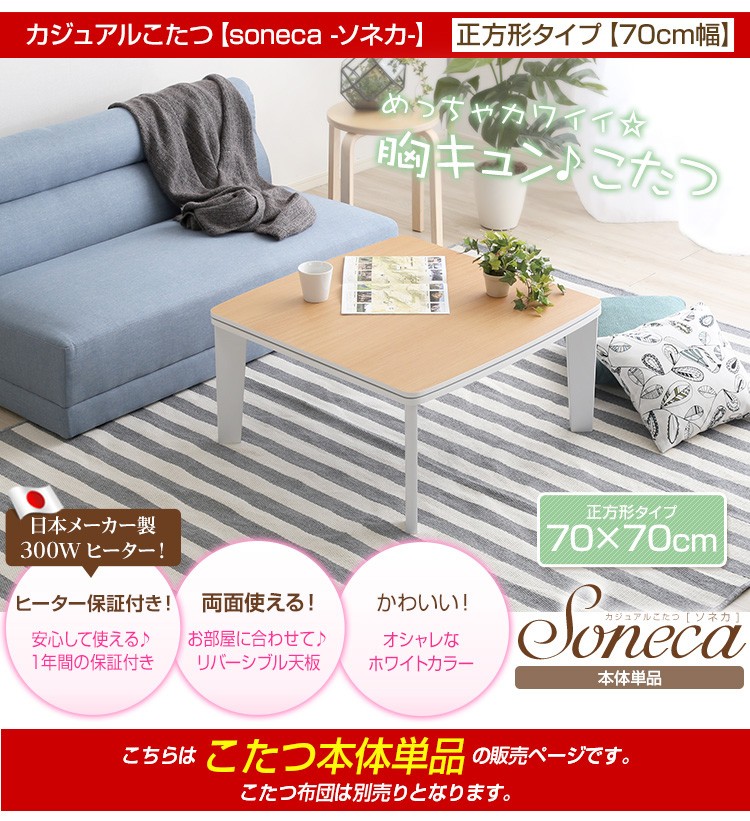 【商品について】カジュアルホワイトこたつ【-Soneca-ソネカ(正方形・70cm幅)】(こたつ 四角 70)■サイズ:本体外寸:(約)幅70x奥行70x高さ35.5cm本体:(約)11.74kg■カラー:本体:ホワイト■素材:天板:パーチクルボード、PVCシート脚:MDF、PVCシート※付属品:300Wヒーター(メトロ電気工業株式会社製)・無段階温度調節機能、温度ヒューズ付・スイッチ付き電源コード■その他:・完成品でお届けします。※脚はお客様取付け本体:(約)73.5x73x11cm本体:(約)12.6kg