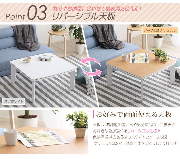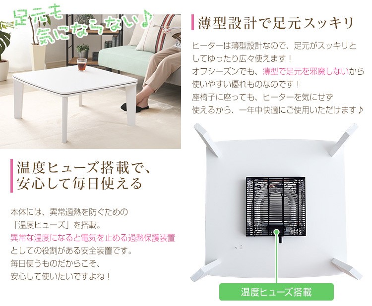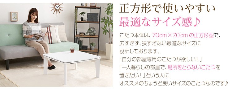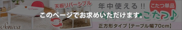 ホワイトカジュアルこたつ【soneca-ソネカ-】正方形タイプ(70×70cm幅) ![]() カジュアルこたつ【topo-トーポ-】正方形タイプ(70×70cm幅)はこちら ![]() カジュアルこたつ【topo-トーポ-】丸型タイプ(直径80cm)はこちら ![]() |
