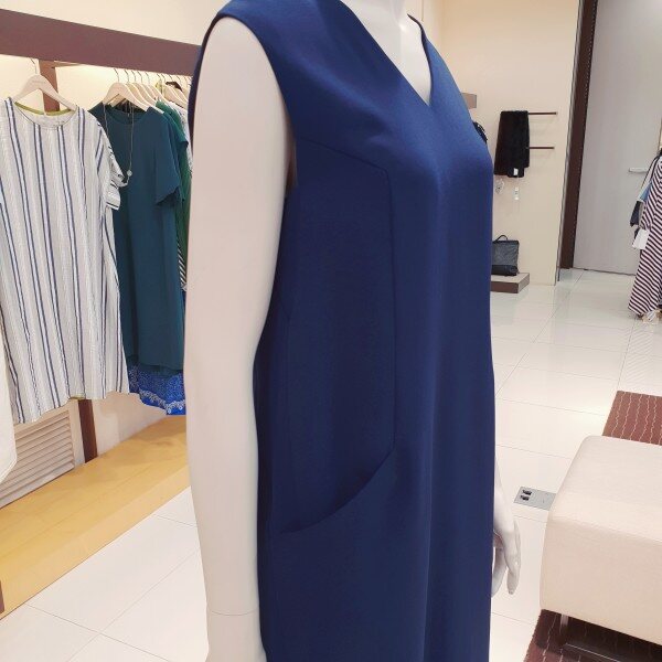 브이넥의 목선에 시원하게 흘러내리는 드레프트성이 좋은 심플 원피스입니다 화려한 스카프나 악세서리와 코디하면멋스런 정장룩으로 연출가능합니다