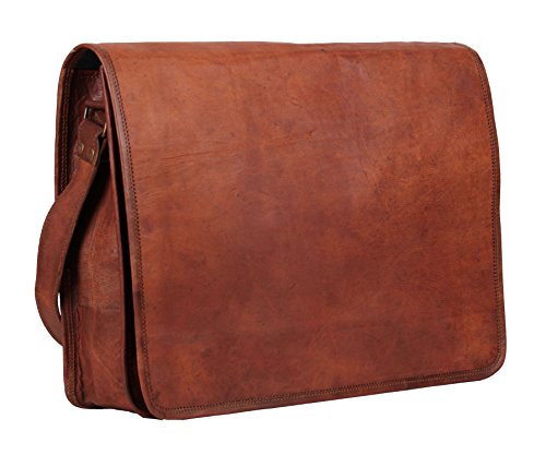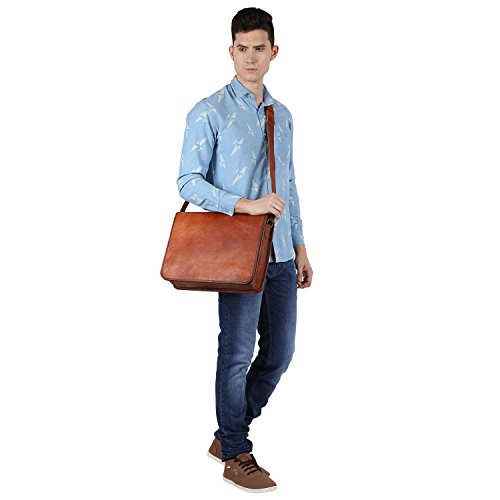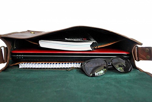 -. Feature : Formal enough for Weekdays & Casual enough for Weekends. Leather Messenger bag / Very Spacious with Dimensions in inches: 15(Length), 11( height) 4 (Depth) / Perfect for Carrying Laptop, Ipad, Files, Notebooks, etc to Office, School, College, etc / Truly Masculine: Strong Brass Fittings & Buckles, Quality Zippers, Olive Green Heavy Duty Canvas Lining / Each Bag Handcrafted from 100% Genuine Goat Hide. Rustic Town is connected with a number of Organizations within India which work to bring employment to artisans and keep alive traditional skills.
