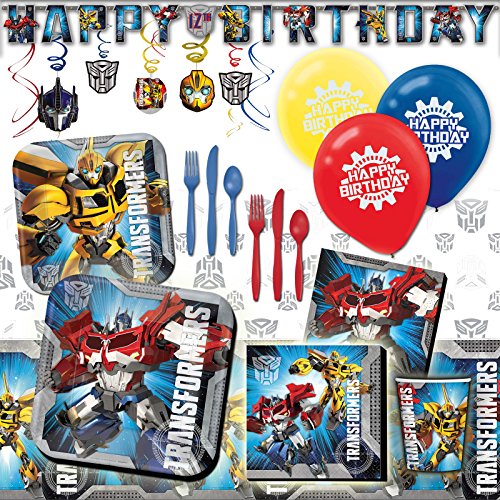 -. Feature : Deluxe party pack Includes: 16 paper 9oz cups, 16 paper 7" plates / 16 paper 9" plates, 16 paper 6.5" napkins, 16 paper 5" beverage napkins / 96" x 54" plastic table cover, 16 Forks, 16 Knives, 16 Spoons / 12 Latex P.R.Inted Balloons, 10ft Add An Age Letter Banner / and 12 Transformers Foil Swing Decorations