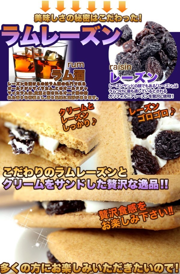 | こだわりのラムレーズンとクリームをサンドした贅沢な逸品です。 |
