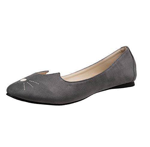 Binding : Apparel Product Description Curl up with these fun kitty cat flats this season -- pair them with leggings for a complete look! These chic flats are detailed with a subtle kitty face embroidery and ear detail. A soft, grey microfiber upper with cream stitching and lining make this super sweet. These also have a cushioned insole and a cute heart tread pattern on the bottom of a super slim black sole. Vegan friendly! 0