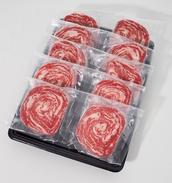 | 独自の飼料を与え 時間をかけて育てられたなかやま牛(交雑種)をスライス肉にし 丁寧にロールしました ジューシーでやわらかく食べやすいロールステーキです |