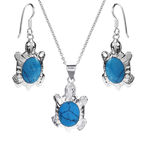 Chic and fashionable, sea turtles inspire the design of this jewelry set. This set features simulated turquoise in sterling silver settings. PLEASE NOTE: The handcrafted nature of this product will produce minor differences in design, sizing and weight. Variations will occur from piece to piece, measurements may vary slightly.Includes an original AERAVIDA organza jewelry pouch (comes in various colors), also handmade by our Artisans. Perfect for gift giving to someone special or keep for yourself!